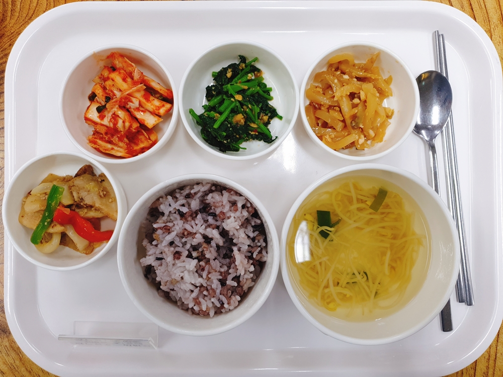 4월 25일 중식은 < 백미밥(죽/잡곡밥) /콩나물국 / 삼겹야채볶음 / 열무된장무침 / 짜사이볶음 / 김치 > 였습니다.