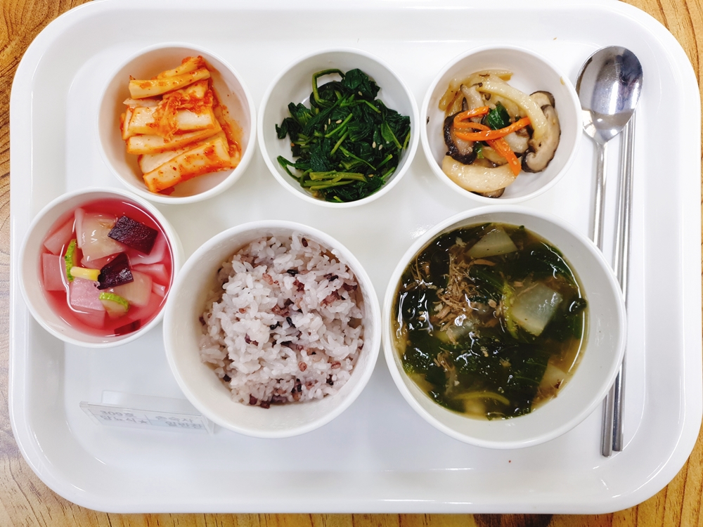 4월 26일 중식은 < 백미밥(죽/잡곡밥) / 오리탕 / 우채표고버섯새송이볶음 / 울릉도취된장무침 / 오이,양파,무피클 / 김치 > 였습니다.
