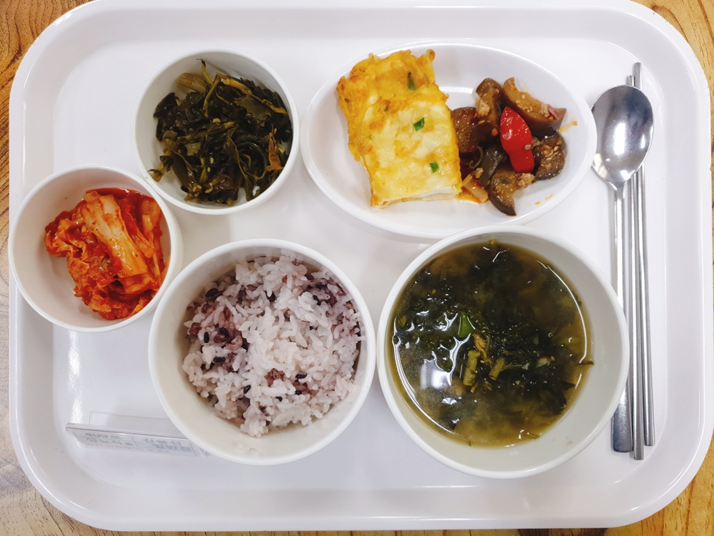 4월 27일 중식은 < 백미밥(죽/잡곡밥) / 바지락쑥국 / 두부계란부침 / 가지돈민찌두반장볶음 / 시래기들깨지짐 / 김치 > 였습니다.