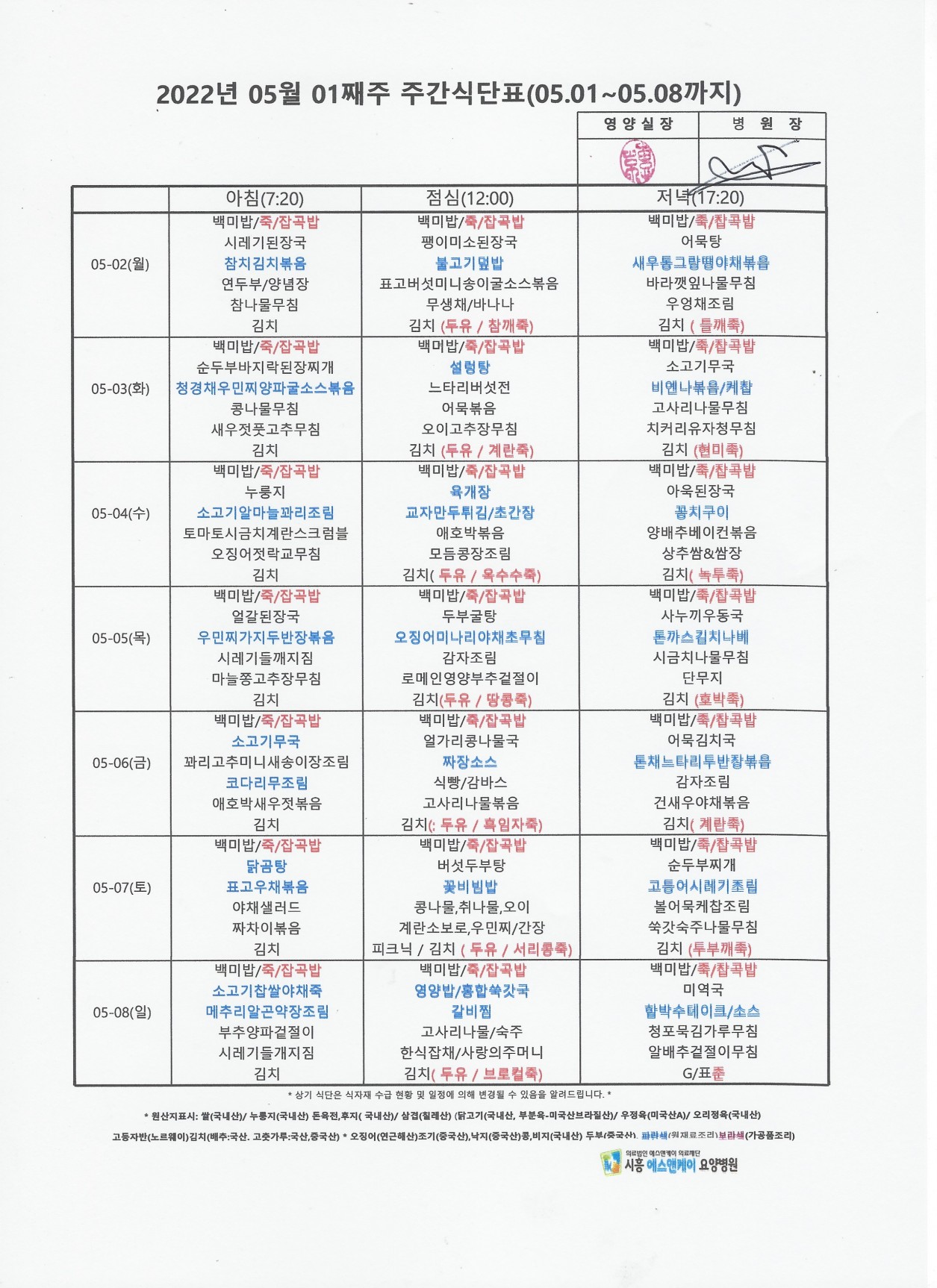 HOME > 병원소식 > 영양식단표