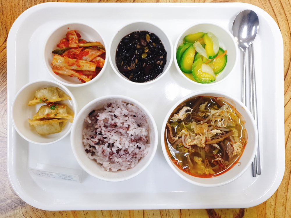 5월 4일 중식은 < 백미밥(죽/잡곡밥) / 육개장 / 교자만두튀김&초간장 / 애호박볶음 / 모듬콩장조림 / 김치 > 였습니다.