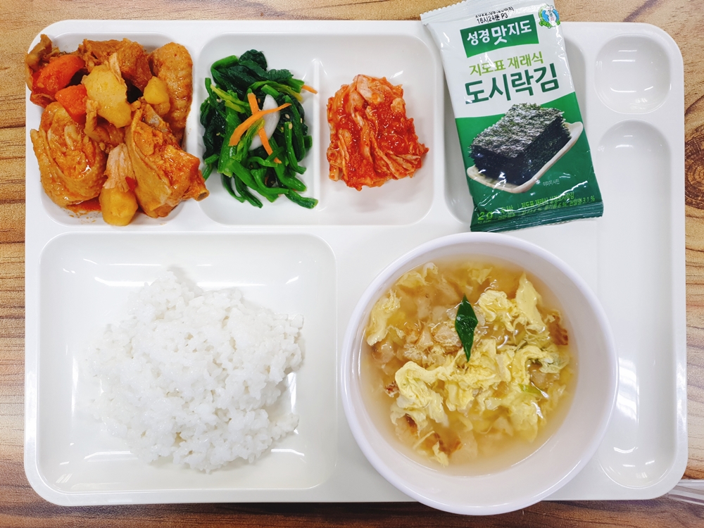 4월 4일 중식은 < 백미밥(죽/잡곡밥) / 북어채계란국 / 닭감자조림 / 시금치나물무침 / 연근조림 / 김치 > 였습니다.