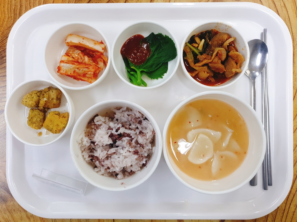 4월 8일 중식은 < 백미밥(죽/잡곡밥) / 수제비김치국 / 오리주물럭 / 곰취나물&쌈장 / 두부까스&소스 / 김치 > 였습니다.