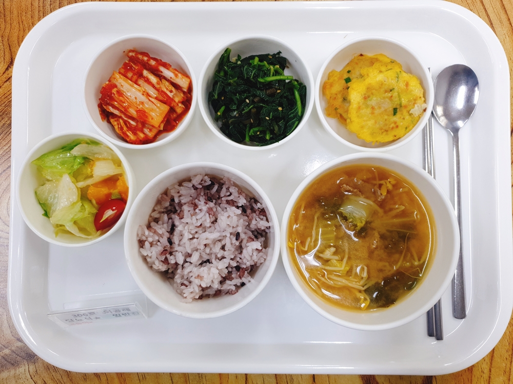 4월 13일 중식은 < 백미밥(죽/잡곡밥) / 소고기해장국 / 도톰동그랑땡부침 / 바라깻잎나물무침 / 양상추과일샐러드 / 김치 > 였습니다.