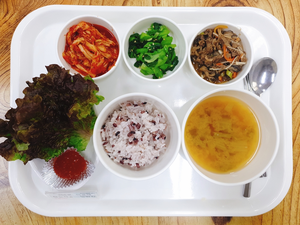 3월 15일 중식은 < 백미밥(죽/잡곡밥) / 얼가리된장국 / 우불고기 / 상추쌈&쌈장 / 청경채나물무침 / 김치 > 였습니다.