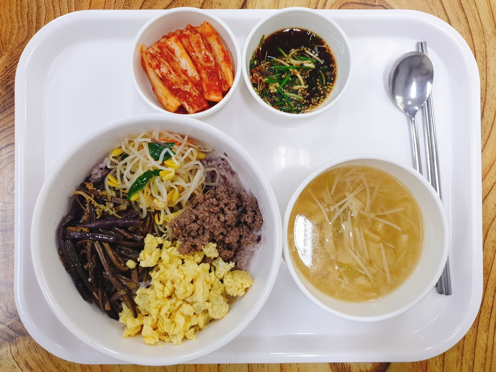 3월 16일 중식은 < 비빔밥(죽/잡곡밥) / 유부된장국 / 우민찌&계란소보로 / 콩나물&고사리&양파 / 달래비빔장 / 김치 > 였습니다.