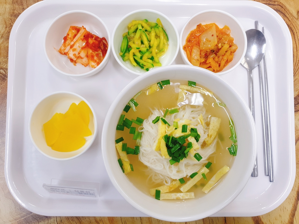 3월 30일 중식은 < 백미밥(죽/잡곡밥) / 잔치국수&지단 / 김치볶음 / 호박채나물 / 단무지 / 김치 > 였습니다.