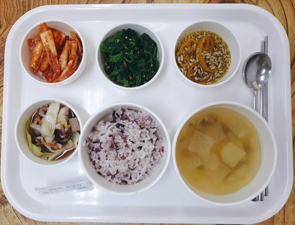 3월 4일 중식은 < 백미밥(죽/잡곡밥) / 바지락무국 / 낙지야채무침 / 시금치나물무침 / 연근견과조림 / 김치 > 였습니다.