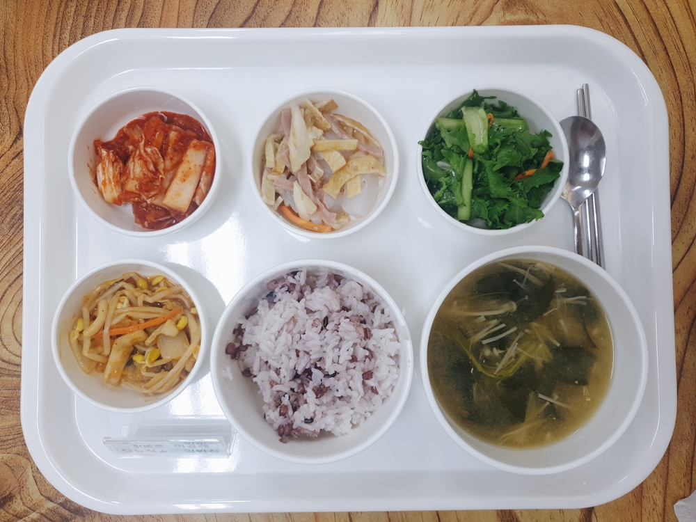 3월 8일 중식은 < 백미밥(죽/잡곡밥) / 팽이취나물된장국 / 콩나물해물찜 / 탕평채 / 치커리유자청샐러드 / 김치 > 였습니다.
