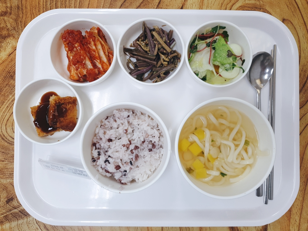3월 10일 중식은 < 백미밥(죽/잡곡밥) / 사누끼우동건더기스프 / 돈까스튀김&소스 / 양상추베이비채소&키위소스 / 고사리나물무침 / 김치 > 였습니다.