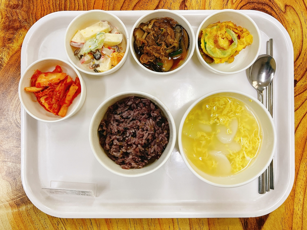 2월 3일 중식은 < 영양밥(죽/잡곡밥) / 떡국 / 우불고기전골 / 애호박전 / 과일샐러드 / 김치 > 였습니다.