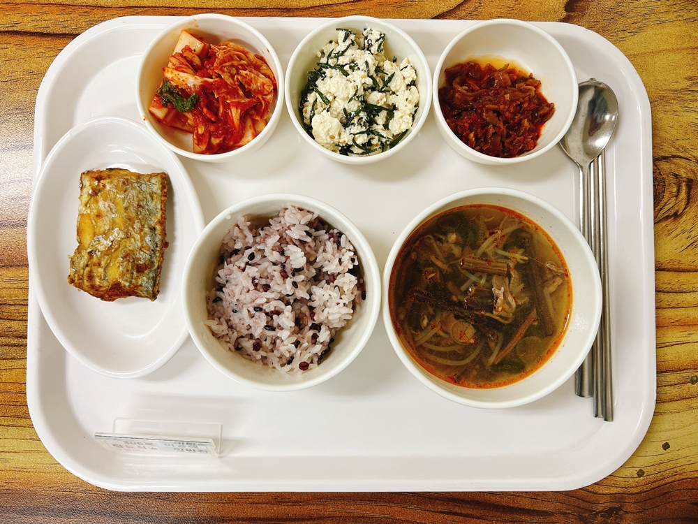 2월 9일 중식은 < 백미밥(죽/잡곡밥) / 육개장 / 갈치카레구이 / 톳두부무침 / 고추양념지 / 김치 > 였습니다.