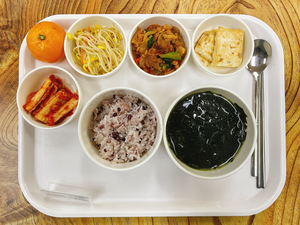 2월 15일 중식은 < 백미밥(죽/잡곡밥) / 소고기미역국 / 제육볶음 / 두부구이&초간장 / 콩나물무침 / 김치 > 였습니다.