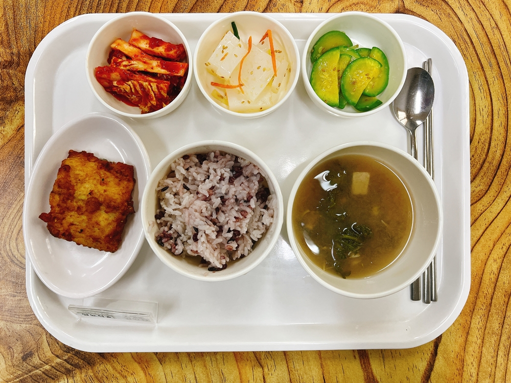 2월 17일 중식은 < 백미밥(죽/잡곡밥) / 냉이두부된장국 / 삼치카레구이 / 애호박볶음 / 청포묵김가루무침 / 김치 > 였습니다.