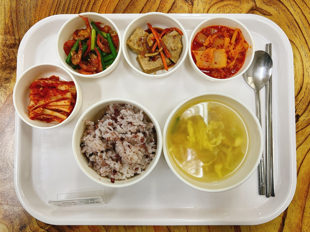 1월 13일 중식은 < 백미밥(죽/잡곡밥) / 북어계란탕 / 함박스테이크&스테이크소스 / 김치지짐 / 건새우마늘쫑볶음 / 김치 > 였습니다.