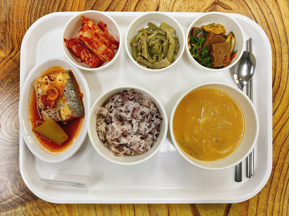 1월 20일 중식은 < 백미밥(죽/잡곡밥) / 김치수제비국 / 갈치무조림 / 궁채나물 / 도토리묵무침 / 김치 > 였습니다.