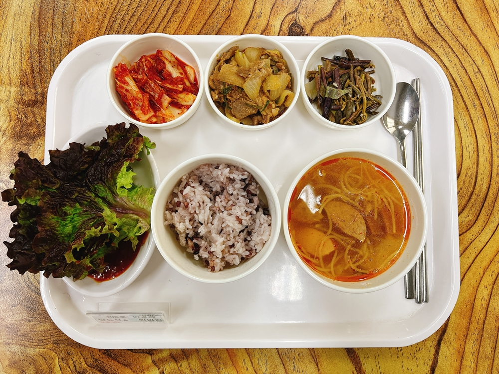 12월 29일 중식은 < 백미밥(죽/잡곡밥) / 부대찌개 / 돈숯불고기 / 상추쌈&쌈장 / 고사리우채볶음 / 김치 > 였습니다.