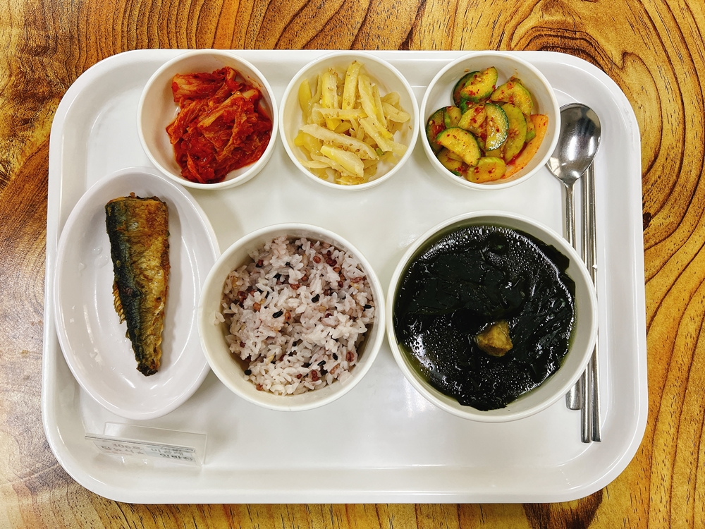 1월 4일 중식은 < 백미밥(죽/잡곡밥) / 소고기미역국 / 꽁치구이 / 도라지나물볶음 / 오이겉절이 / 김치 > 였습니다.