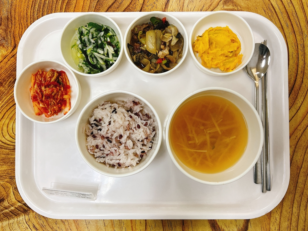 1월 11일 중식은 < 백미밥(죽/잡곡밥) / 팽이미소된장국 / 불고기낙지볶음 / 단호박감자범벅 / 물파래무침 / 김치 > 였습니다.