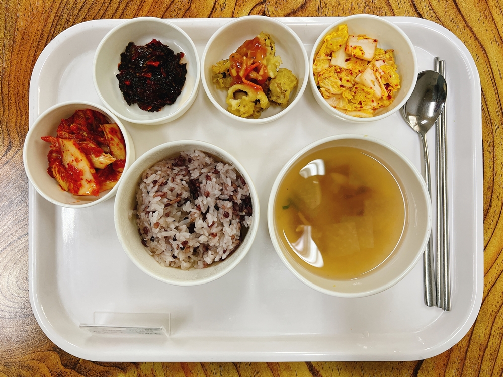 1월 12일 중식은 < 백미밥(죽/잡곡밥) / 오징어무국 / 표고탕수육&탕수소스 / 알배기겉절이 / 고들빼기무침지 / 김치 > 였습니다.