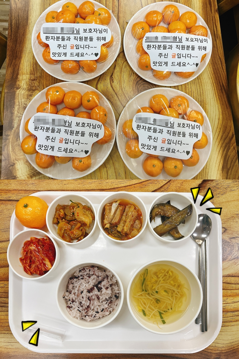 환자 보호자분께서 감사하게도 환자분들과 직원분들을 위해 귤을 제공해 주셔서, 환자분들과 직원분들 모두 나눠드렸습니다.