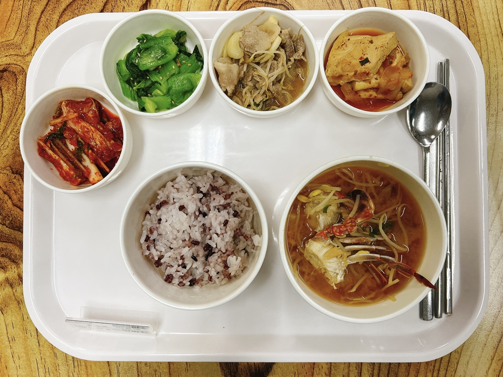 12월 15일 중식은 < 백미밥(죽/잡곡밥) / 꽃게된장국 / 대패삼겹숙주볶음 / 두부양념조림 / 청경채나물무침 / 김치 > 였습니다.