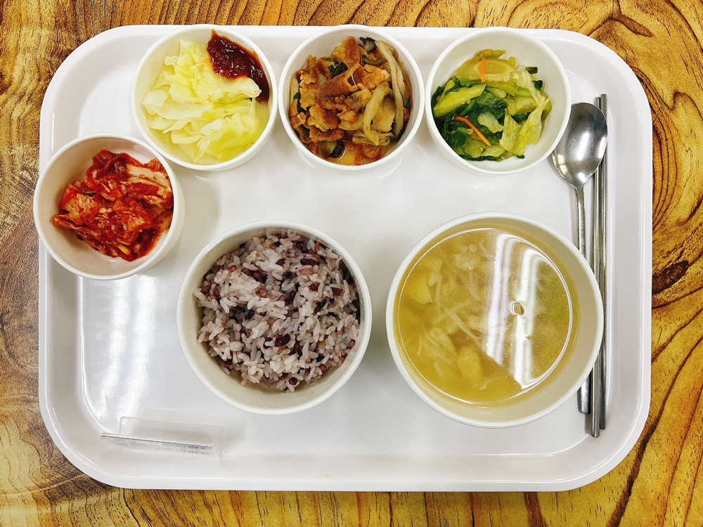 12월 21일 중식은 < 백미밥(죽/잡곡밥) / 팽이유부맑은국 / 돈육불고기 / 양배추쌈&쌈장 / 청경채야채굴소스무침 / 김치 > 였습니다.