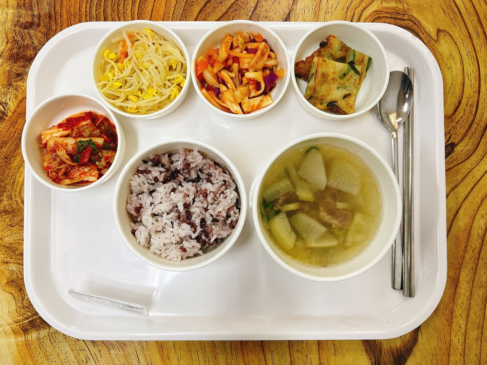 12월 23일 중식은 < 백미밥(죽/잡곡밥) / 소고기무국 / 해물파전 / 오징어숙회야채무침 / 콩나물무침 / 김치 > 였습니다.