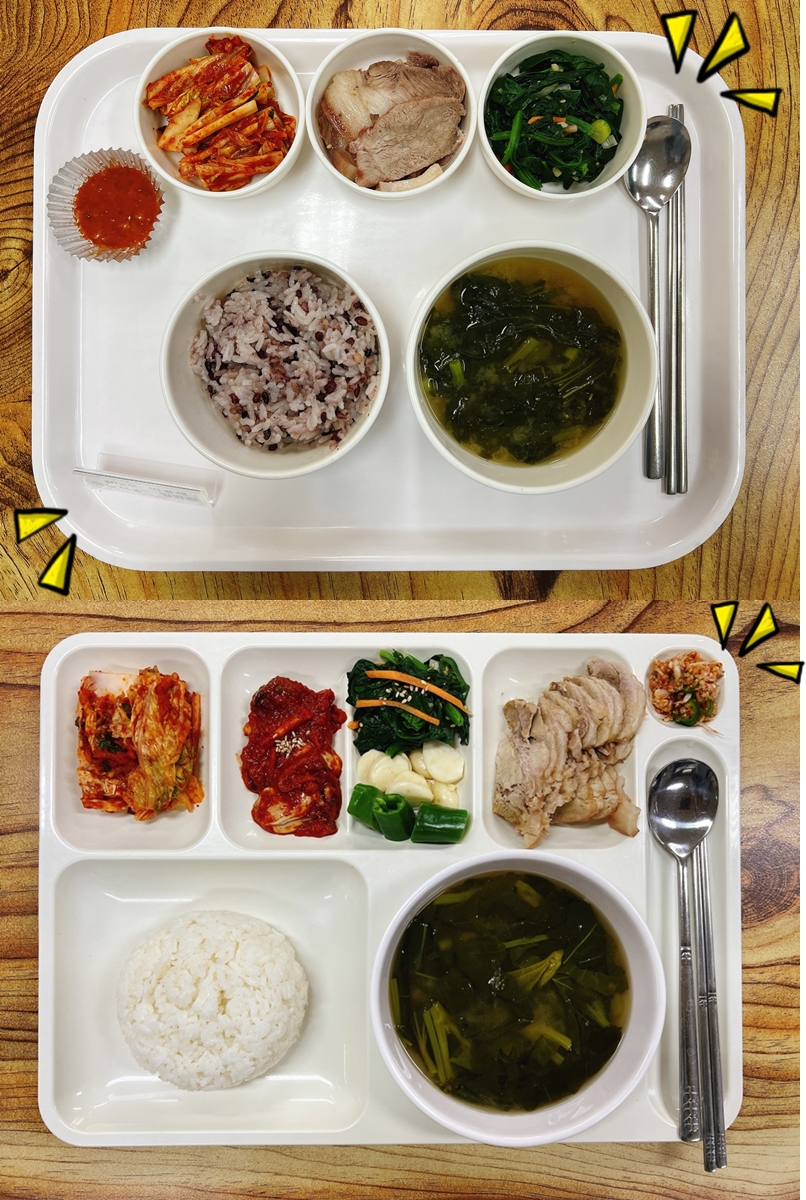 11월 17일 중식은 < 백미밥(죽/잡곡밥) / 아욱된장국 / 돈수육&배추절임속 / 시금치나물무침 / 굴속김치 / 김치 > 였습니다.