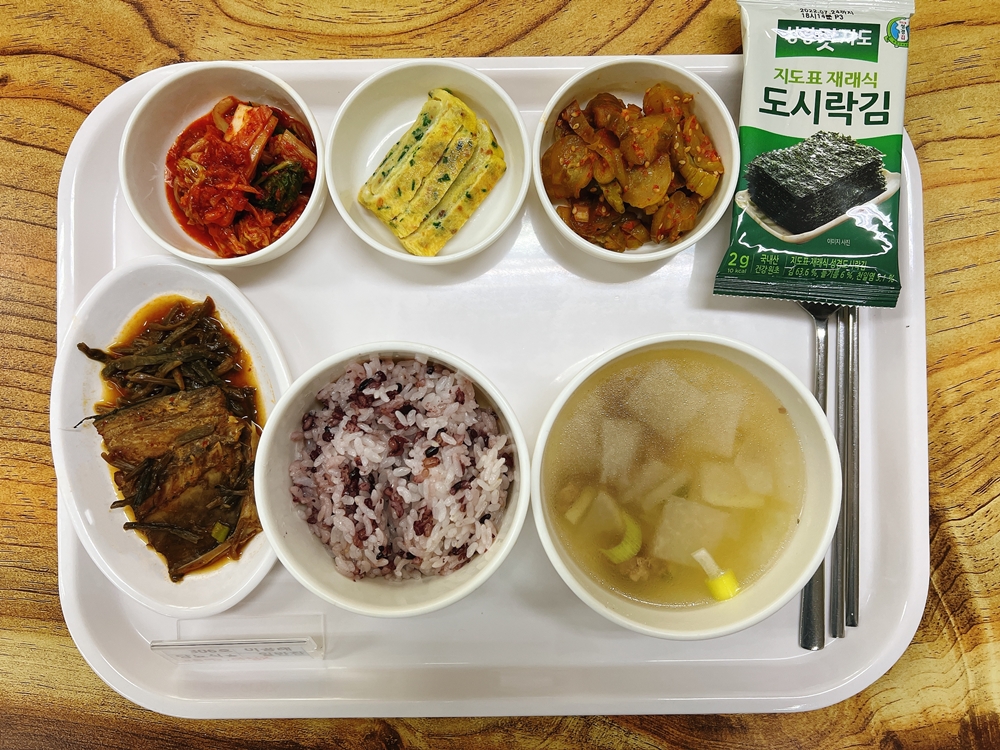 11월 18일 중식은 < 백미밥(죽/잡곡밥) / 소고기무국 / 고등어고구마순지짐 / 오이지무침 / 계란말이&식탁김 / 김치 > 였습니다.