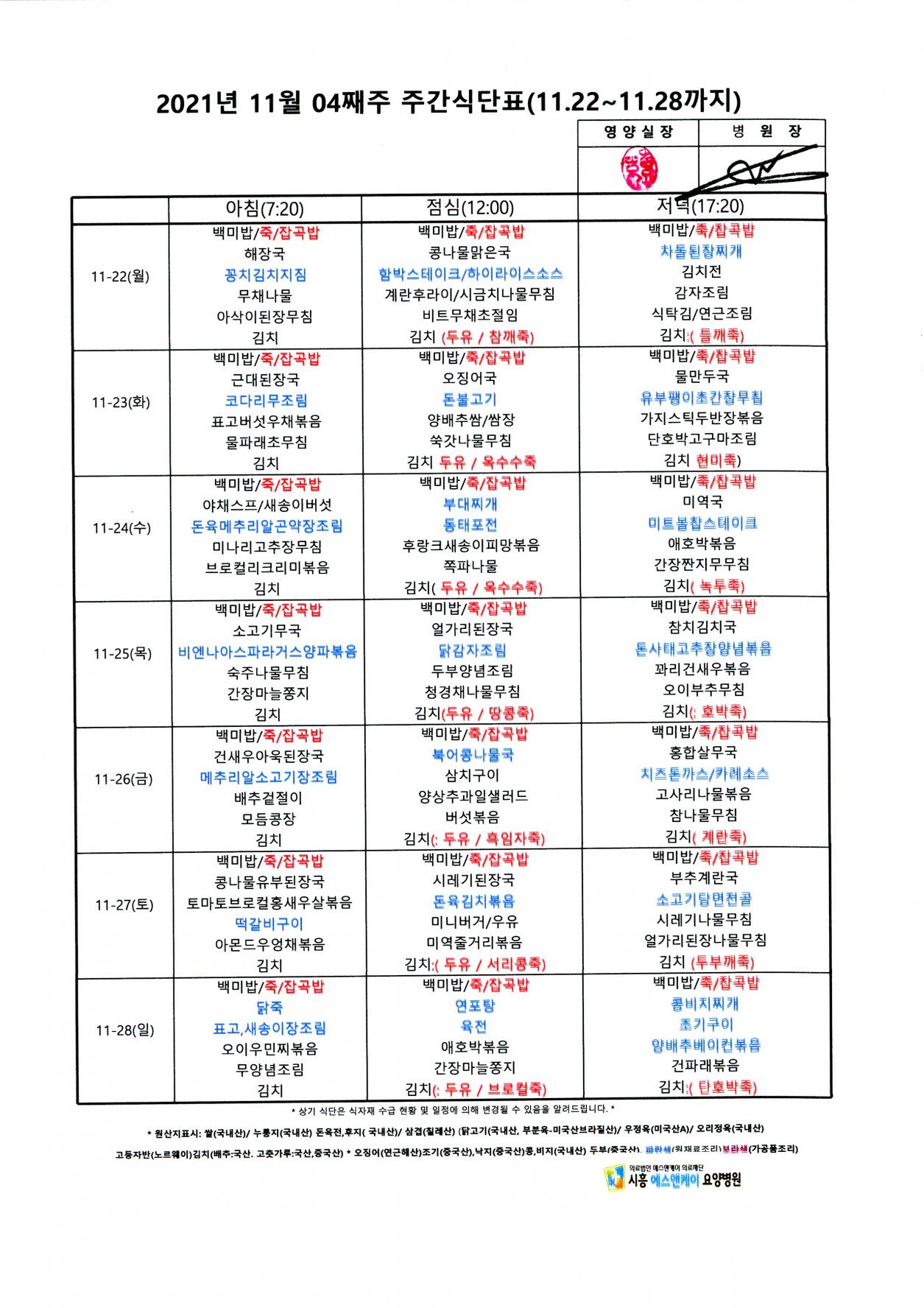 HOME > 병원소식 > 영양식단표