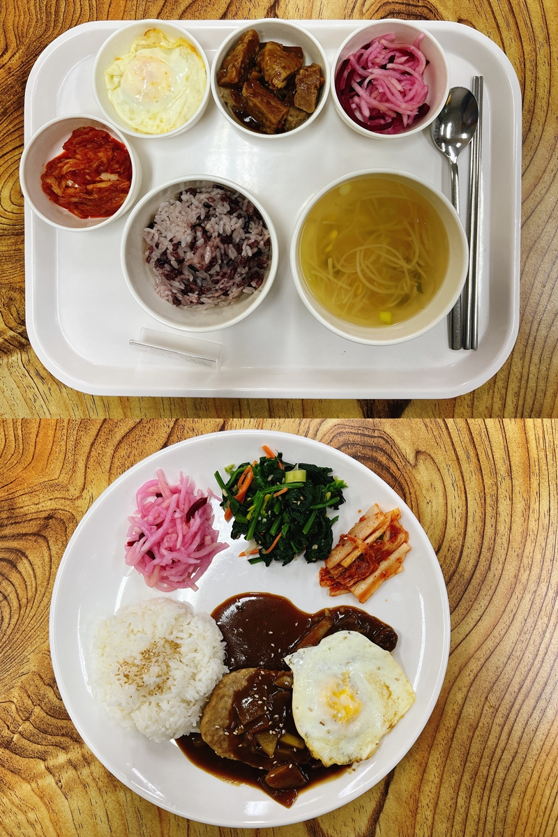 11월 22일 중식은 < 백미밥(죽/잡곡밥) / 콩나물맑은국 / 함박스테이크&하이라이스소스 / 계란후라이&시금치나물무침 / 비트무채초절임 / 김치 > 였습니다.
