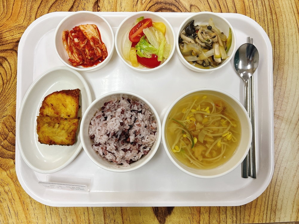 11월 26일 중식은 < 백미밥(죽/잡곡밥) / 북어콩나물국 / 삼치구이 / 양상추과일샐러드 / 버섯볶음 / 김치 > 였습니다.