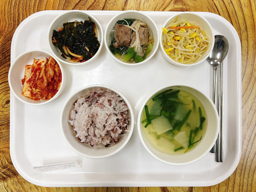 11월 29일 중식은 < 백미밥(죽/잡곡밥) / 새우젓무맑은국 / 소고기샤브샤브 / 콩나물무침 / 미역양파초무침 / 김치 > 였습니다.