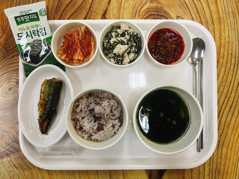 11월 30일 중식은 < 백미밥(죽/잡곡밥) / 매생이굴탕 / 꽁치카레구이 / 톳두부무침 / 도시락김&양념고추지 / 김치 > 였습니다.