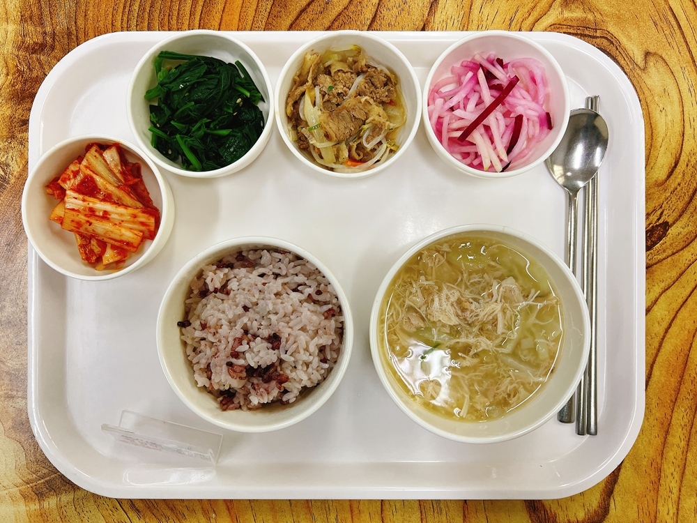 12월 01일 중식은 < 백미밥(죽/잡곡밥) / 닭곰탕 / 숙주차돌볶음 / 포항초나물무침 / 비트무채 / 김치 > 였습니다.