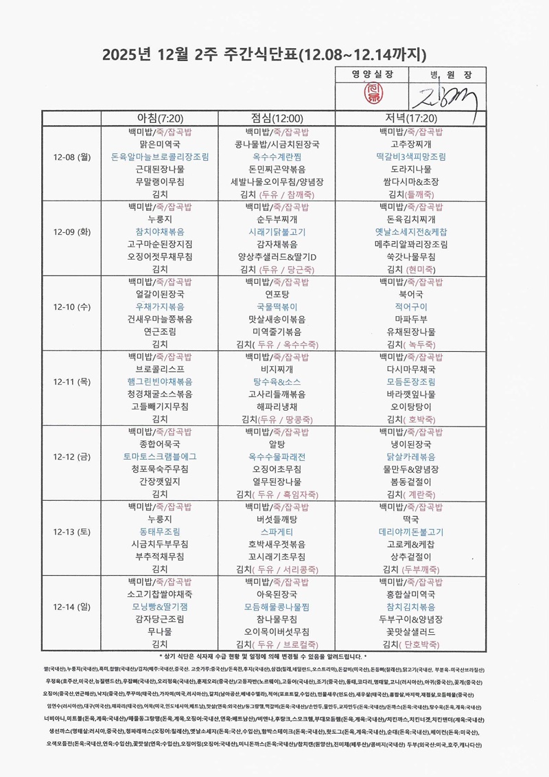 HOME > 병원소식 > 영양식단표