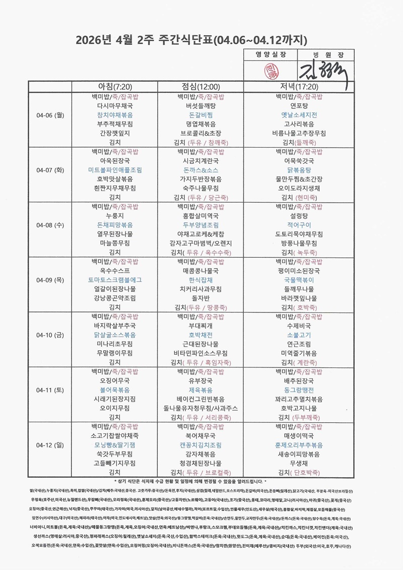 HOME > 병원소식 > 영양식단표