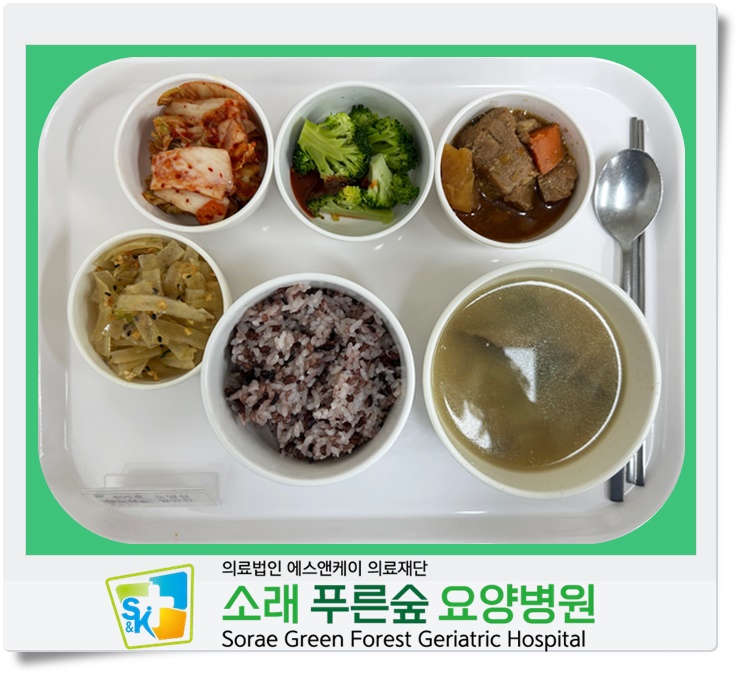 ▷ 04월 06일 중식 : 백미밥(죽/잡곡밥) /버섯들깨탕/ 돈갈비찜/ 명엽채볶음/ 브로콜리&초장 / 김치 ◁