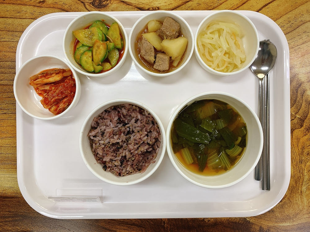 10월 25일 중식은 < 영양밥(죽/잡곡밥) / 얼갈이미소된장국 / 돈사태감자조림 / 무나물 / 오이고추장무침 / 김치 > 였습니다.