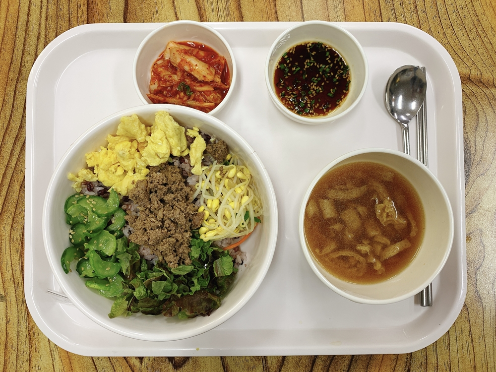 11월 04일 중식은 < 비빔밥(죽/잡곡밥) / 유부된장국 / 콩나물&우민찌&오이절임 / 상추&계란후라이 / 간장&고추장 / 김치 > 였습니다.