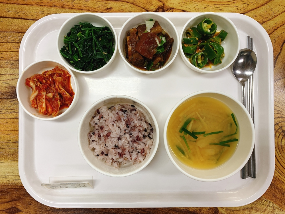 11월 05일 중식은 < 백미밥(죽/잡곡밥) / 무채미소된장국 / 한방갈비찜 / 시금치나물무침 / 아삭이된장무침 / 김치 > 였습니다.