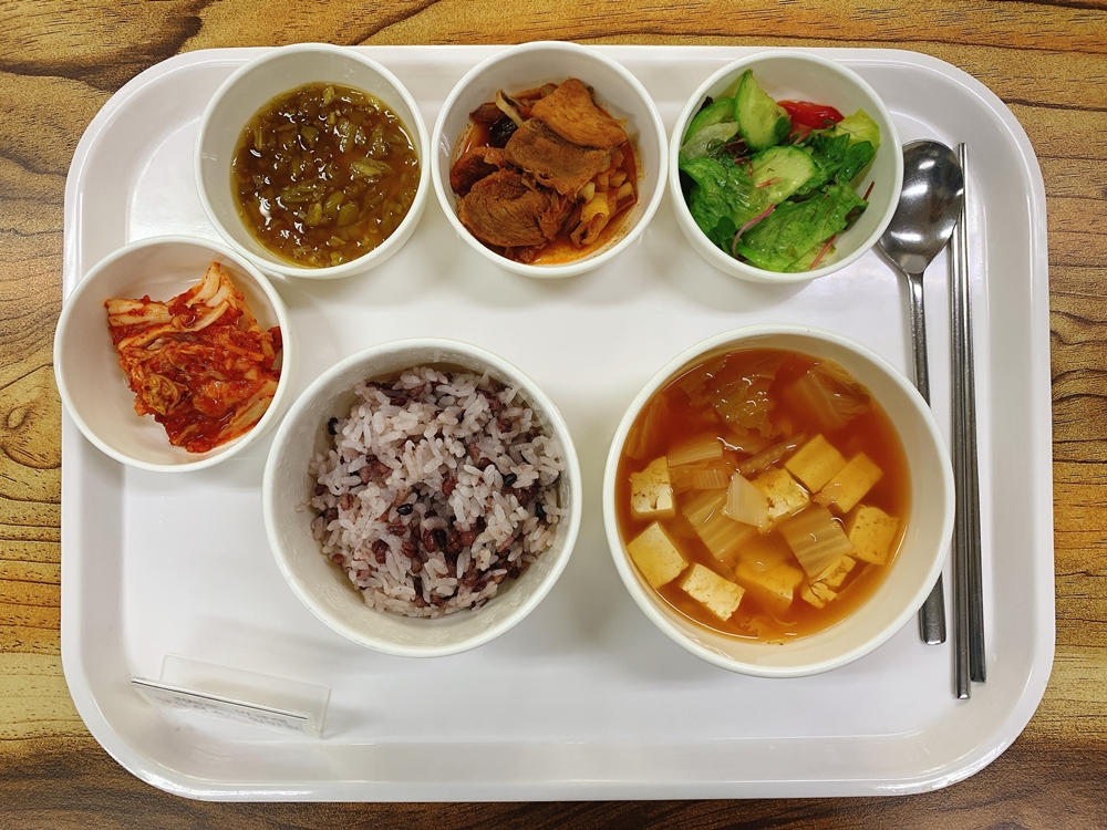 11월 11일 중식은 < 백미밥(죽/잡곡밥) / 김치두부국 / 오징어돈육볶음 / 양상추야채샐러드 / 고추간장지 / 김치 > 였습니다.