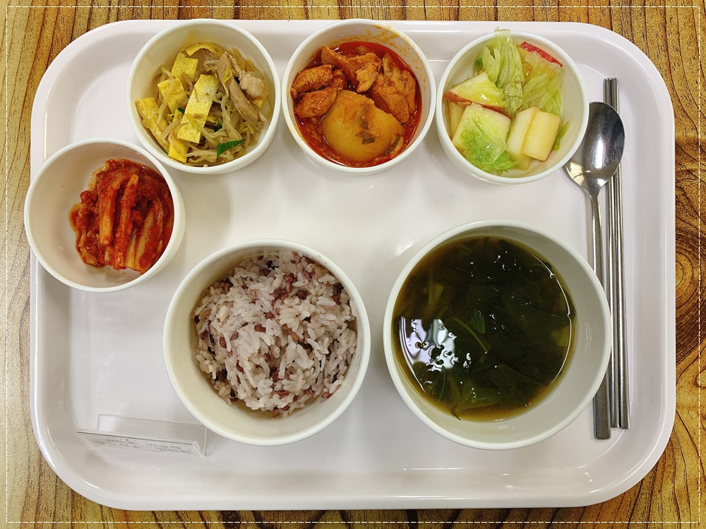 10월 06일 중식은 < 백미밥(죽/잡곡밥) / 아욱국 / 닭감자조림 / 탕평채 / 양상추과일샐러드 / 김치 > 였습니다.