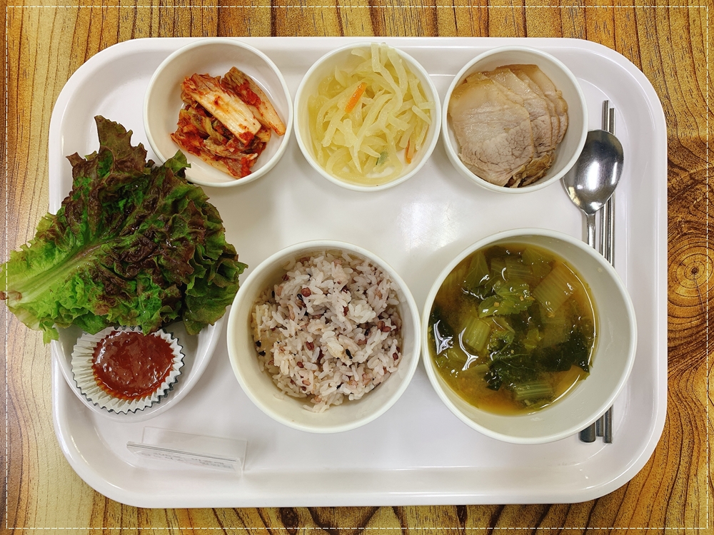 10월 07일 중식은 < 백미밥(죽/잡곡밥) / 얼갈이된장국 / 돈수육&쌈장 / 상추쌈 / 무채나물 / 김치 > 였습니다.