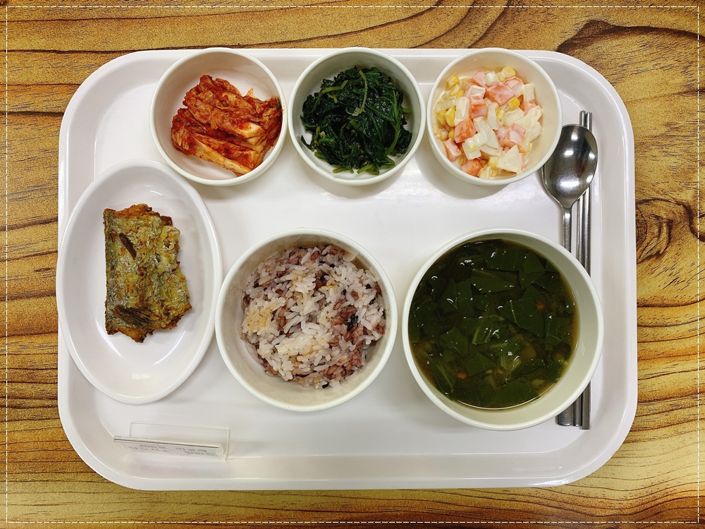 9월 16일 중식은 < 백미밥(죽/잡곡밥) / 근대된장국 / 갈치구이 / 바라깻잎나물무침 / 콘샐러드 / 김치 > 였습니다.