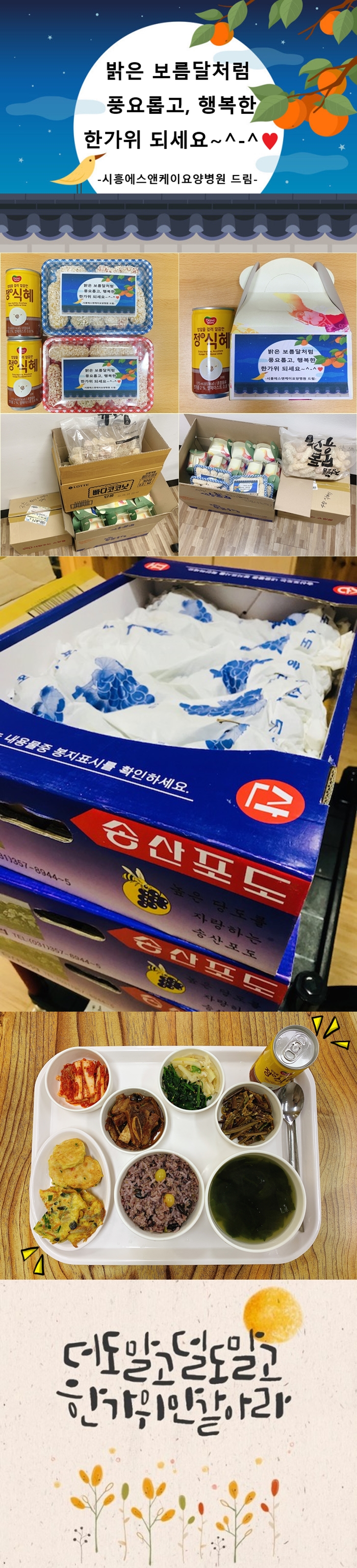 추석을 맞아 영양실에서 정성 가득 포장하여 준비한 한과와 식혜, 포도를