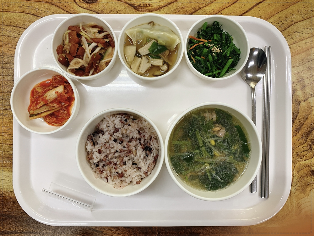 9월 2일 중식은 < 백미밥(죽/잡곡밥) / 해장국 / 만두전골 / 쑥갓나물무침 / 오복지양파무침 / 김치 > 였습니다.