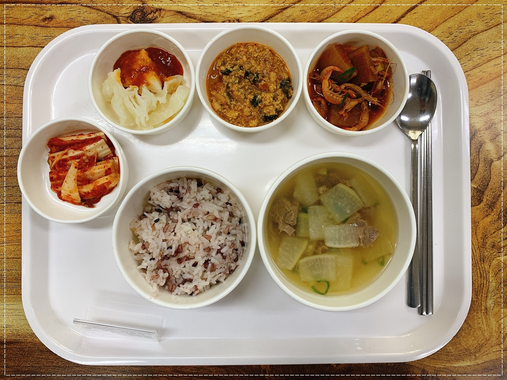 9월 7일 중식은 < 백미밥(죽/잡곡밥) / 소고기무국 / 우렁강된장 / 양배추쌈&쌈장 / 민물새우무양념조림 / 김치 > 였습니다.