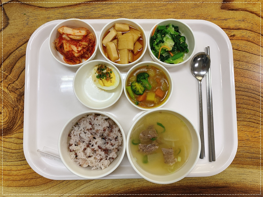 8월 24일 중식은 < 백미밥(죽/잡곡밥) / 소고기무국 / 카레소스 / 청경채볶음 / 계란장조림 / 무깍두기피클 / 김치 > 였습니다.